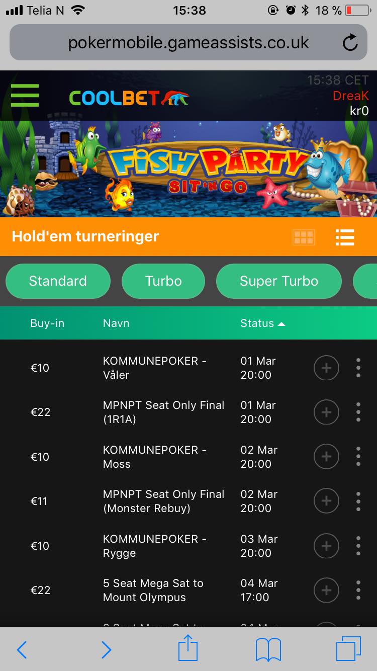 Du er nå inne i poker-lobbyen, og finner kommune-turneringen din om du blar nedover!