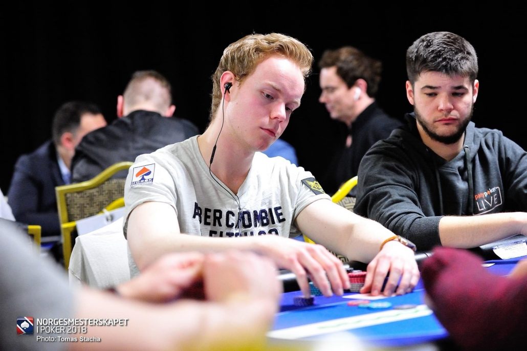 -Turneringen startet greit. Jeg fikk chippa opp litt tidlig, der jeg fikk spilt en del potter og fikk bygd opp et bra press. Jeg tapte en stor pot med QQ mot 79o der Thomas Skålevik har floppa straight. Jeg faller ned på halv startstack og er nødt til å jobbe igjen for å chippe opp. Fra dette punktet lå jeg vel jevnt og trutt på 20 storeblind nesten frem mot finalebordet. Da får jeg endelig revansjen min mot Skålevik, der han åpner fra Cutoff og jeg går all in for 19 storeblind fra lilleblind med AJ i hjerter. Skålevik har QQ og snapsyner. Her har jeg hellet med meg og treffer esset på flop. Jeg kommer inn på finalebordet med nest mest chips, og har egentlig trua på at dette kommer til å gå ganske bra. Det er ingen som spiller tilbake mot meg, og jeg kan åpne ganske vidt og får spille mange hender. Det var med andre ord ingen problem å ha chippie til min venstre. Jeg kunne spille små potter ute av posisjon, og fikk spille større potter i posisjon. De fleste spiller veldig forsiktig og putter omtrent ikke penger inn i potter, med mindre de får ett treff. Som gjør det veldig lett å manøvrere finalebordet. Jeg fortsetter og chippe ned big stacken og vinner flere potter fra de andre spillerne. Etterhvert tar jeg over rollen som chipleader, og fortsetter jobben med å ta ned potter. På ett punkt sitter vi fireveis og jeg har en klar ledelse med 40 storeblind, der alle andre har færre enn 10. Jeg slår ut en spiller etter den andre og ender til slutt heads up med 38bb mot 7. Deretter var det grei skuring, oppsummerer Eidsvolls kommunemester Marius Hoel.